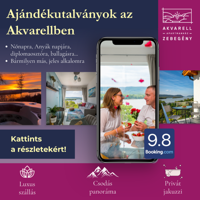 Az Akvarell Apartmanház, mint kitűnőre értékelt szállás Zebegényben várja feltöltődésre és pihenésre vágyó vendégeit varázslatos és egyedi panorámával a Dunára, a Pilis- és a Visegrádi- hegységre, amely számos alkotóművészt megihletett már az idők folyamán.